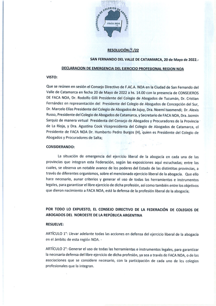 F.A.C.A NOA: Resolución 24/22 Declaración de Emergencia del Ejercicio Profesional Región NOA