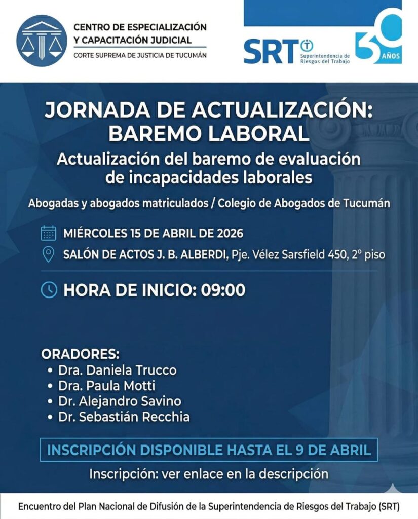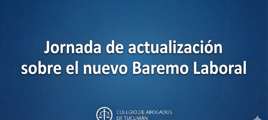 El Colegio de Abogados de Tucumán informa a sus matriculados que el Centro de Especialización y Capacitación Judicial del Poder Judicial de Tucumán invita a participar de una Jornada de actualización sobre el nuevo Baremo Laboral, centrada en sus aspectos clave y su aplicación práctica.