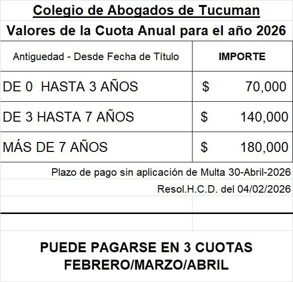 El Colegio de Abogados de Tucumán informa a sus matriculados y matriculadas los valores y las formas de pago de la Cuota Anual de Matrícula correspondiente al año 2026, conforme a lo resuelto por el Honorable Consejo Directivo en fecha 04 de febrero de 2026.