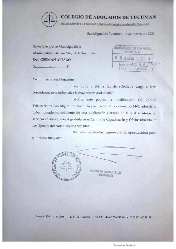 El Colegio de Abogados de Tucumán solicitó coordinar una audiencia con el Intendente de la Municipalidad de San Miguel de Tucumán, German Alfaro, para tratar la suspensión del servicio de "Asesoría Jurídica Gratuita" que el municipio estaría publicitando en sus redes sociales y consideramos perjudican al libre ejercicio profesional. Asimismo trabajar sobre distintos temas inherentes al ejercicio profesional; como la modificación del Código Tributario Municipal que afectaría a nuestros matriculados, y otros profesionales.